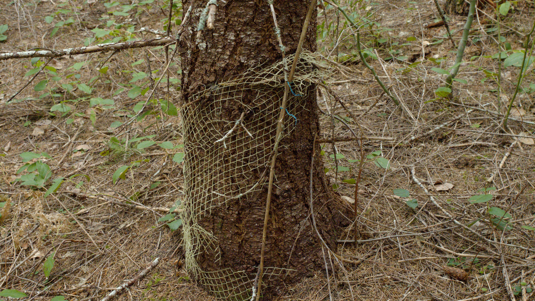 This tree was planted as a sapling during some reforestation effort, supported by a bamboo stake and surrounded by plastic netting to keep the deer from eating it. That was apparently some years ago.
